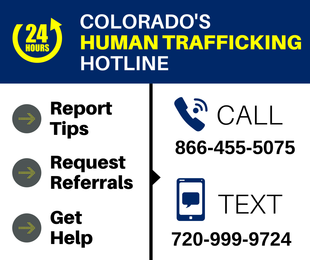 If you or someone you know is a victim of human trafficking and would like to report a tip, access resources or get help, contact: